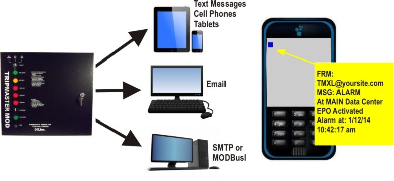 The optional (TM-AD) allows the TM-MOD to remotely announce alarms using the Internet to email, cell phones, SMTP or MODBUS. This option requires an Ethernet connection to the Internet provided by others. The alarm inputs to the TM-AD are factory pre-wired. Six total alarm types can be sent to remote cell phones or tablets as text messages. Emails can be sent to remote PCs or direct connection to other facility monitoring or control systems using SNTP or MODBus. TM-AD is field programmed via web browser and the TM-AD stores historical data logging of alarm events.
